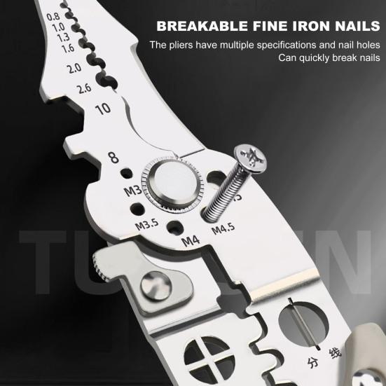 Save time and money with this versatile tool that combines multiple functions into one. Ideal for any toolbox, it significantly enhances work efficiency by eliminating the need for frequent tool changes. Made from high-quality carbon steel, it performs a range of tasks such as wire cutting, stripping, crimping, and screwing with precision. The precisely designed stripping holes ensure clean cuts without damaging the wire core, and its ergonomic PVC-coated handle ensures comfortable, long-term use. This multi-functional tool is a must-have for any electrician or DIY enthusiast, offering exceptional durability and versatility for various electrical tasks.